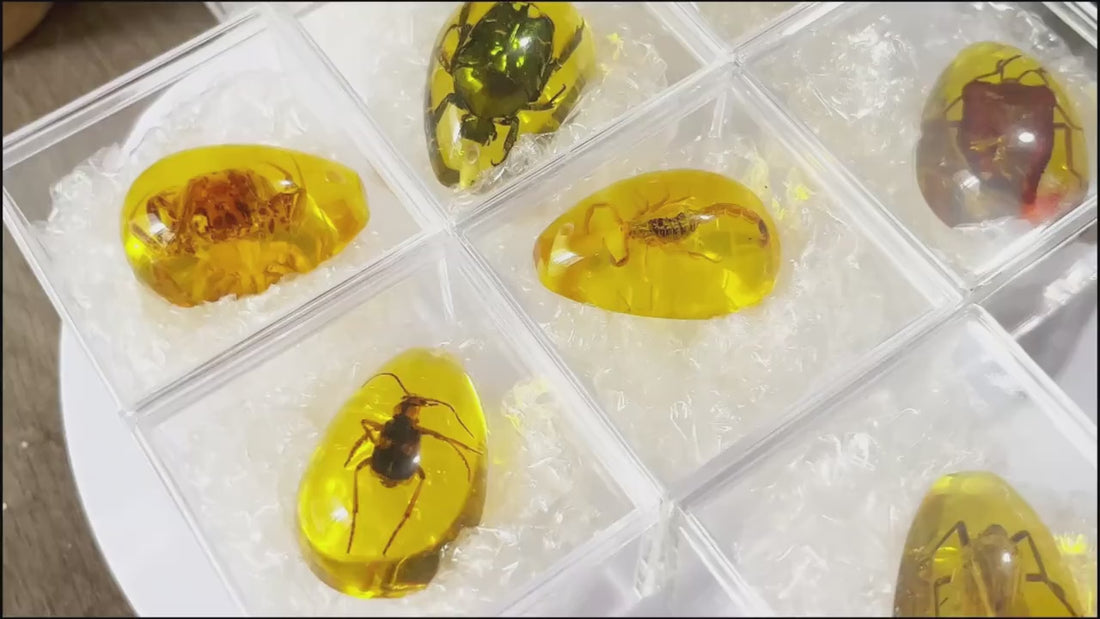 Simuleret ravsæt (2 stk.) med udstillingskasser – pædagogisk og dekorativ gaveidéSimuleret ravsæt (2 stk.) med udstillingskasser – pædagogisk og dekorativ gaveidé
